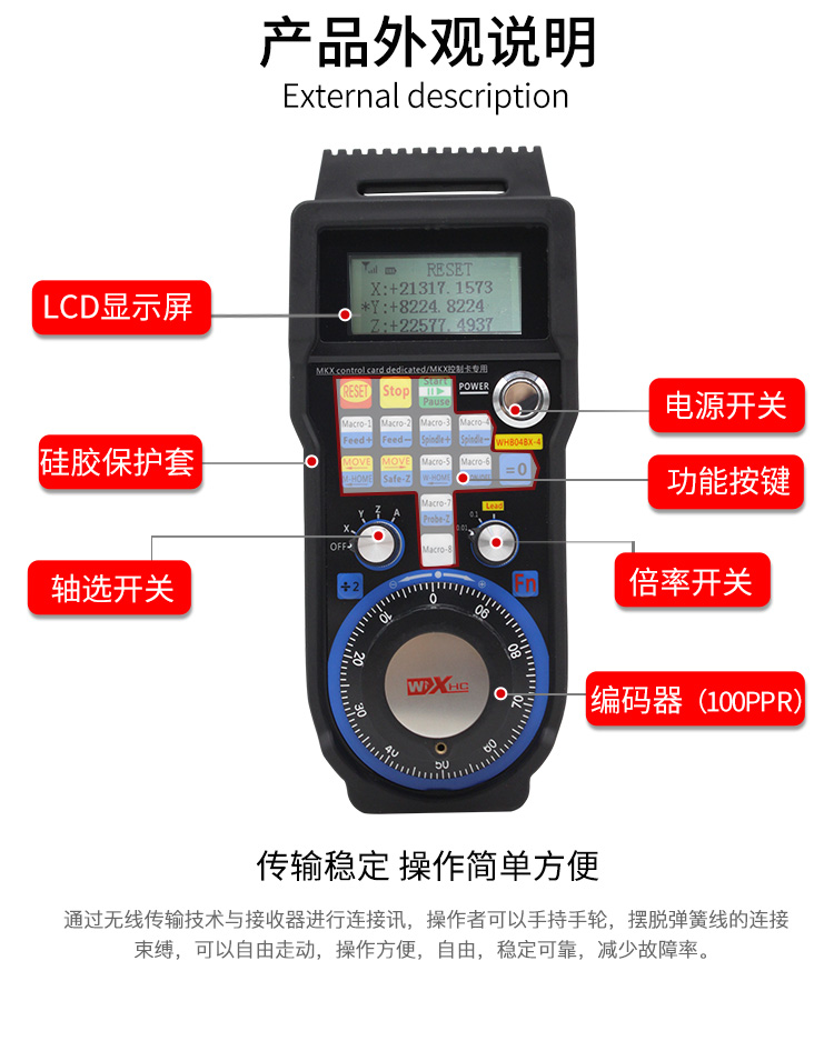 3.手輪采用背光LCD顯示屏,可以同時(shí)顯示3個(gè)軸的坐標(biāo)值,電量信息,信號(hào)強(qiáng)度等。